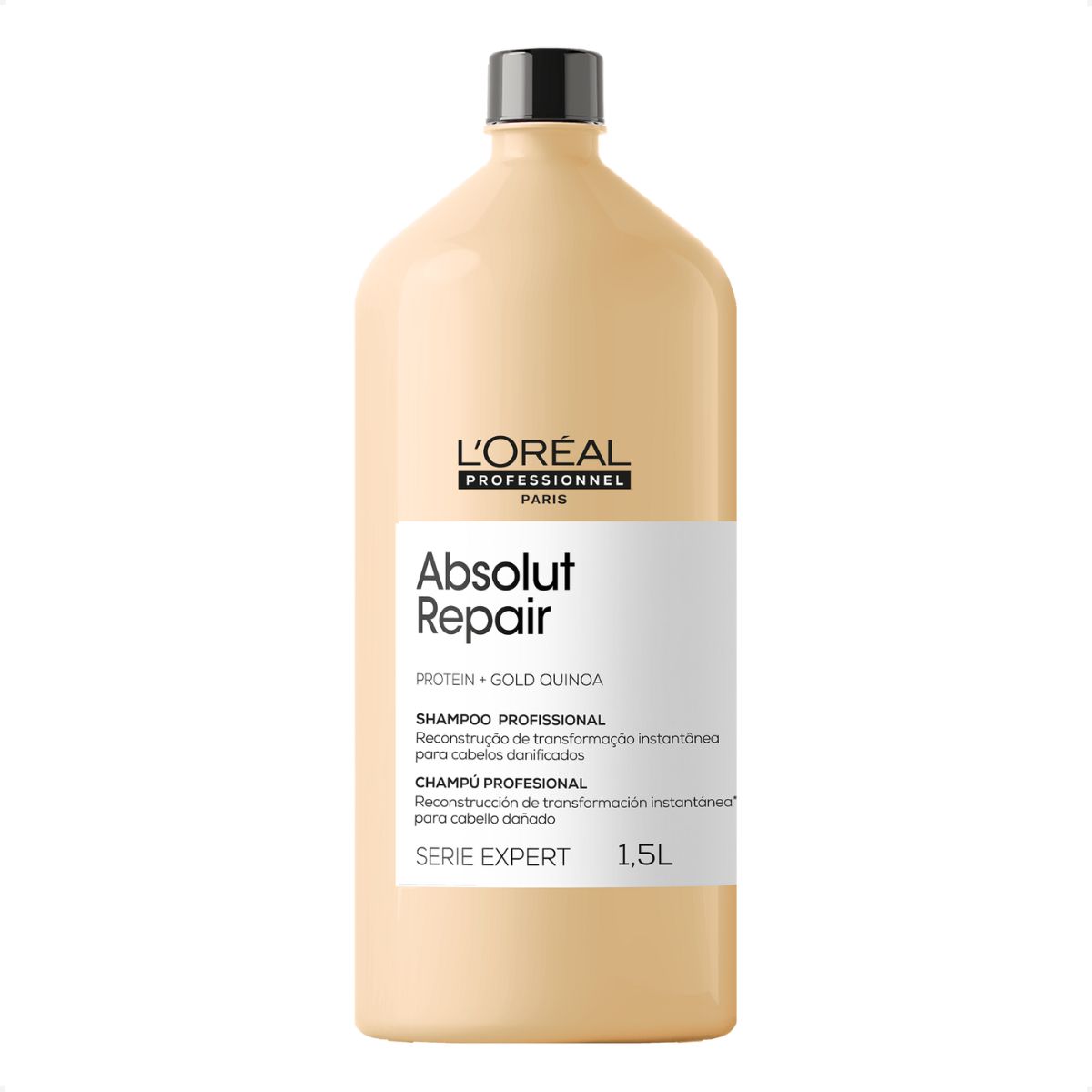 O Shampoo Absolut Repair limpa suavemente enquanto repara intensamente a fibra capilar danificada. Sua fórmula com Gold Quinoa + Proteína devolve força, maciez e brilho imediato aos fios fragilizados.